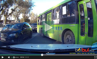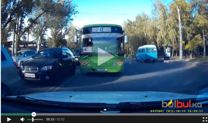 «В Бишкеке на пересечении улиц Ахунбаева-Советская водитель автобуса №42 выехал на встречную полосу дороги и включил аварийки, другой водитель принципиально не уступил дорогу. Так оба водителя создали аварийную ситуацию и автобус, и тот, кто перед ним встал».