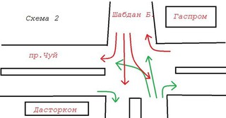 По его словам, в данный момент используется схема №1. «По схеме заметно, что автолюбители не дожидаясь дополнительного сигнала светофора выполняют поворот налево и создают аварийную ситуацию и пробки. Я предлагаю использовать схему №2, так как она безопаснее и пропускная способность больше», - написал он.