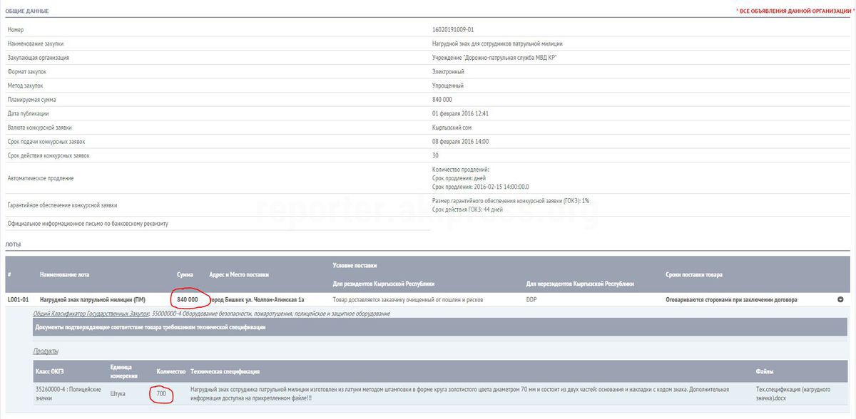 «ДПС объявила тендер на закупку 700 значков на сумму 840 тыс. сомов, получается каждый значок по 1,2 тыс. сомов.