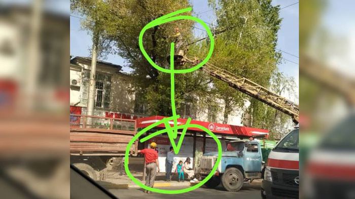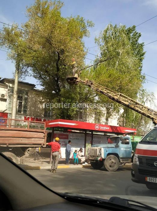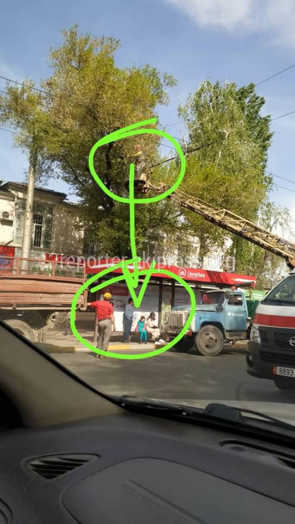 На пересечении проспекта Манаса и улицы Боконбаева идет обрезка деревьев. Горожанин интересуется соблюдается ли техника безопасности при обрезке веток.