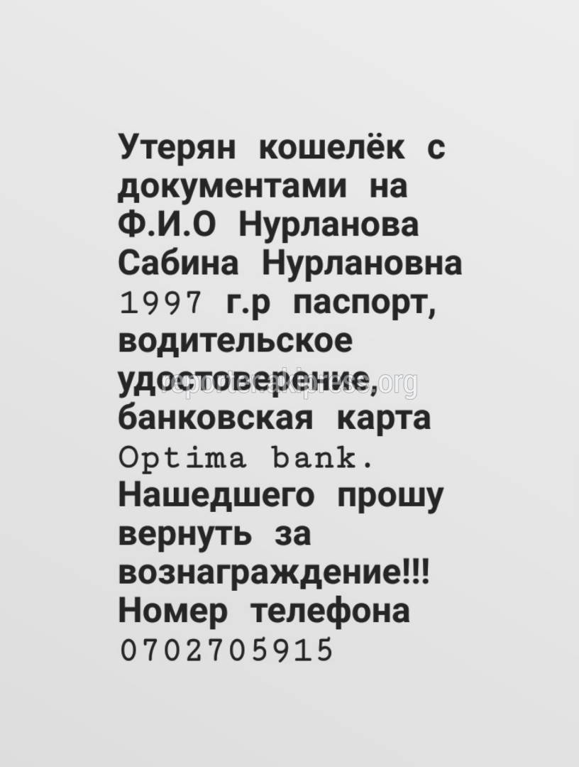 Утерян кошелек с документами на имя Сабины Нурлановой 1997 г.р. 13 июля 2019, 10:40 (обновлено: 13 июля 2019) 13139 Утерян кошелек с документами, Нурланова Сабина Нурлановна 1997 года рождения. Паспорт, водительское удостоверение, банковская карта. Нашедшего просьба вернуть за вознаграждение. Звонить по номеру (0702)705915 11 Есть новость? Сообщи нам по номеру 0550 01 03 11 или через приложение «Репортер АКИpress»! -Поделиться-Твиттер-WhatsApp- Телеграм 13139 Просмотры Читайте Репортер в t.me/ReporterAKIpress